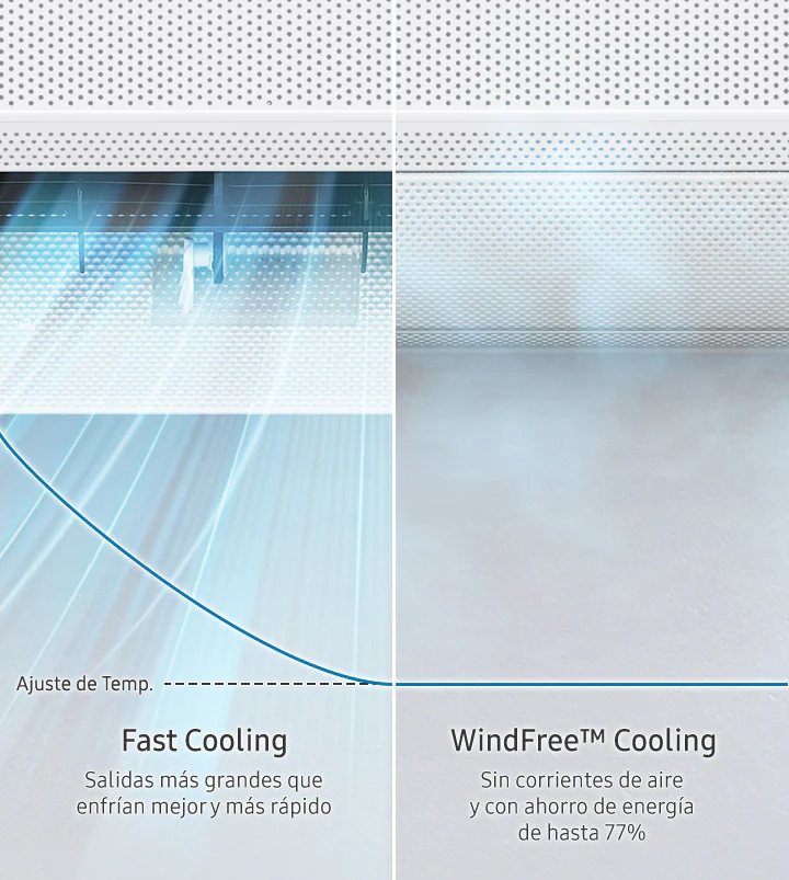 También, existen los aires acondicionados WindFree que al activar el modo WindFree consume hasta 77% menos energía que en modo Fast Cooling. Así, podrás mantenerte fresco sin preocuparte por tu recibo de luz.