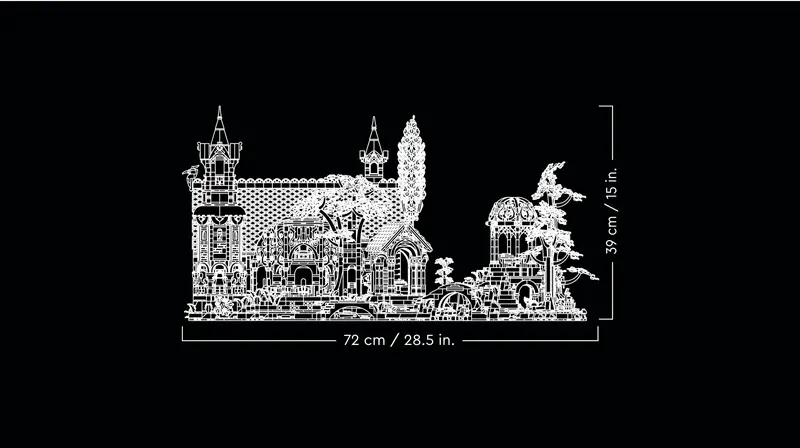 - Dimensiones: El set mide aproximadamente 39 cm de altura, 72 cm de anchura y 50 cm de profundidad; se divide en 3 secciones: la torre, el foro del Concilio y el cenador, con el río y el puente